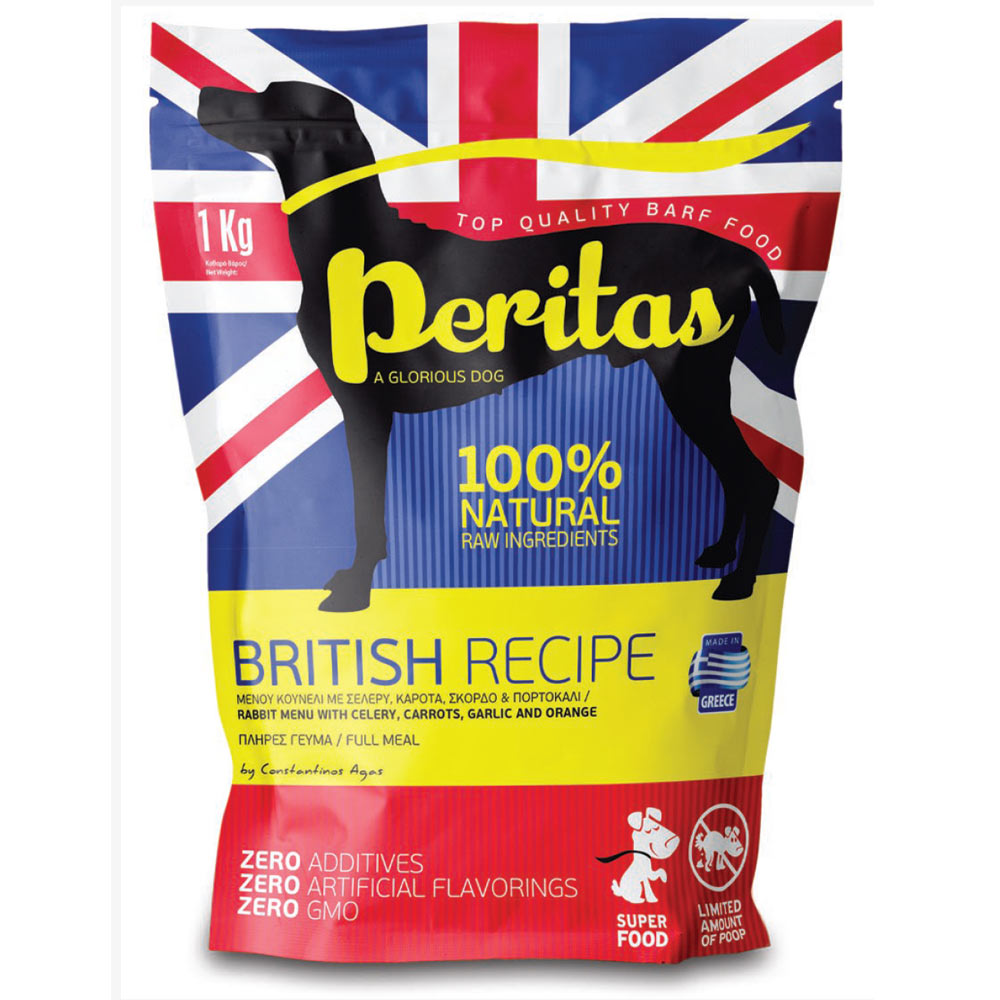 Τα κεφτεδάκια είναι ένα νέο προϊόν BARF πολύ χρηστικό κυρίως για μικρόσωμες φυλές σκυλιών. Η "British Recipe" από την Peritas αποτελεί ένα πλήρες, υψηλής ποιότητας γεύμα, που περιλαμβάνει φρέσκο, άπαχο κρέας ολόκληρου κουνελιού από ελληνική εκτροφή με το συκώτι του και εμπλουτίζεται με φρέσκα λαχανικά και φρούτα. Αυτό το μενού είναι εύπεπτο και προσφέρει υψηλή απορρόφηση θρεπτικών συστατικών. Είναι ένα 100% φυσικό προϊόν, χωρίς προσθήκη συντηρητικών ή χρωστικών, που συμβάλλει ουσιαστικά στην υγεία και την καλή κατάσταση των σκύλων.